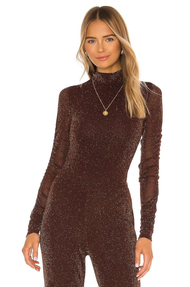 Metallic dark brown lurex fabric and delicate ruching along the long sleeves define this fitted bodysuit with a chic mock neck. Its sleek silhouette and snap button closure at the bottom offer both style and functionality. Perfect for a night out, cocktail parties, or date nights, this elegant piece blends trendy metallic shimmer with sophisticated design, making it a versatile addition to your autumn and winter wardrobe.
