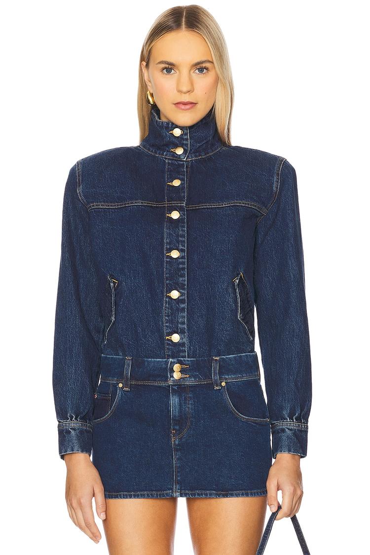 Midweight cotton denim crafted into a classic waist-length bodysuit jacket with a regular fit and long regular sleeves. The stand collar and button closure down the front enhance its timeless appeal, while padded shoulders add subtle structure. Functional side flap pockets and buttoned cuffs offer practical style elements. Ideal for casual streetwear, everyday use, or travel, this versatile piece suits spring and autumn seasons with its durable fabric and structured silhouette.