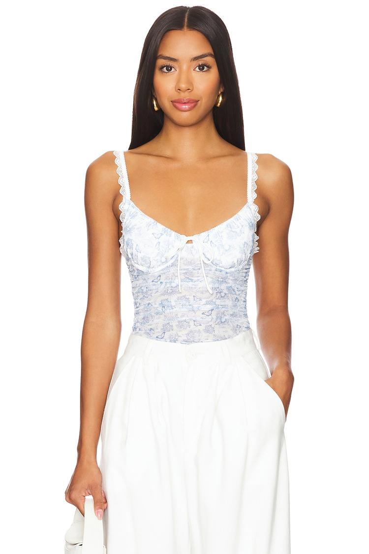 Delicate ruched mesh fabric combined with lace trim creates an alluring silhouette in this fitted bodysuit featuring unpadded underwire cups and adjustable shoulder straps. The sweetheart neckline and sleeveless design enhance its modern, sexy vibe, making it ideal for summer nights out, casual dates, or chic gatherings. The floral pattern in soft blue on a white base adds a romantic touch, while the snap gusset and hook-and-eye back closure provide functional ease. Perfect for layering or wearing alone, this bodysuit brings effortless sophistication to your wardrobe.