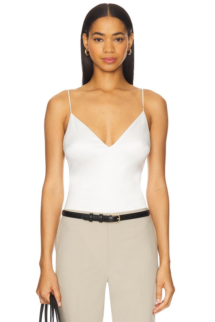 Sleek and refined, this close-fitting bodysuit features a plunging V-neckline and delicate spaghetti straps crafted from midweight matte white satin fabric. Designed for versatility, its cropped length and adjustable shoulder straps ensure a perfect fit, making it a timeless piece ideal for casual outings, workwear layering, or an elegant date night. The snap gusset closure adds functionality without compromising the minimalist silhouette. This classic bodysuit elevates any outfit with its understated elegance and smooth texture, embodying modern sophistication with ease.