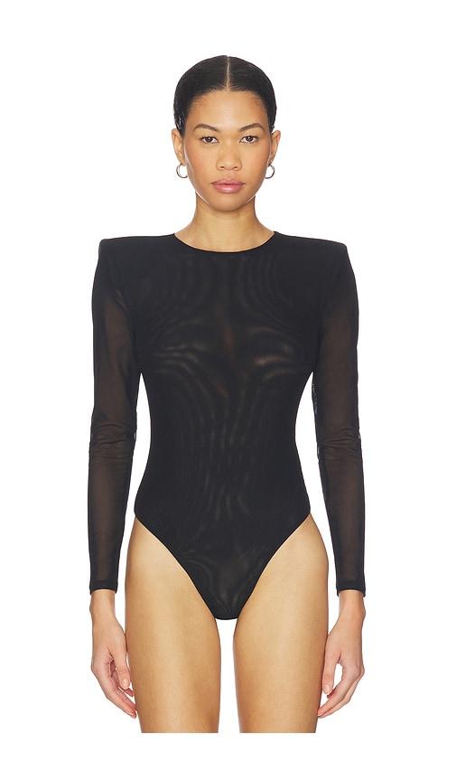 L'AGENCE TRISTA SHOULDER PAD BODYSUIT IN BLACK.