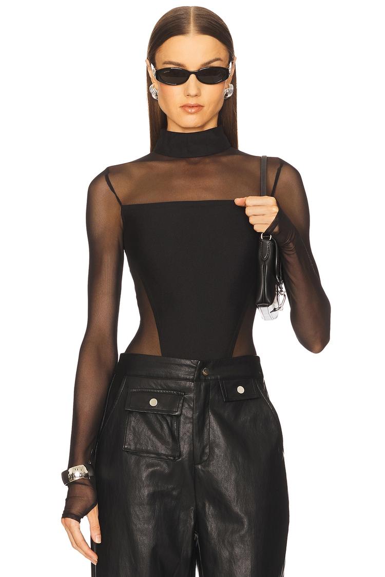 A sleek black bodysuit crafted from lightweight mesh with sheer long sleeves and a high neckline offers a striking silhouette. The fitted cut and hidden back zipper with hook and eye closure ensure a smooth, streamlined fit. This modern and sexy piece is perfect for casual outings, date nights, or evening events where you want to make a bold statement. The sheer panels add an alluring touch, while the thong back provides seamless wear under any outfit.