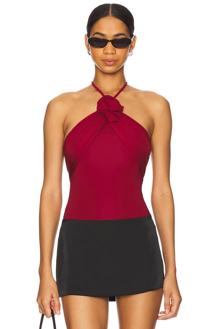 A matte burgundy bodysuit with a fitted silhouette and halter neck tie straps featuring a flower accent creates an alluring and modern look. Crafted from midweight ruched jersey fabric blending nylon and elastane, it offers comfortable stretch and shape retention. The open back design adds a sexy edge, perfect for spring and summer evenings. Ideal for casual outings, date nights, or night outs, this chic bodysuit combines style and comfort effortlessly, making it a versatile addition to your wardrobe.