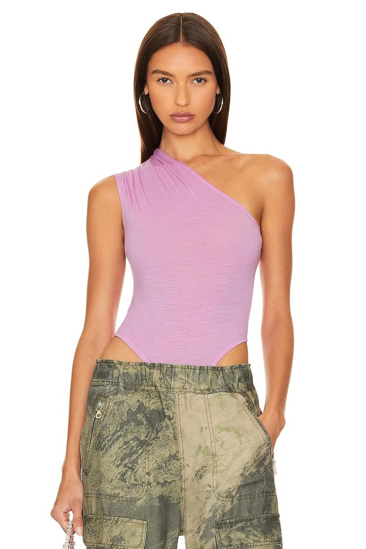 Soft ribbed jersey fabric in a dusty pink hue highlights this fitted bodysuit's modern asymmetric neckline and sleeveless silhouette. The one-shoulder styling and high V-cut hem create a sexy yet chic vibe, perfect for spring and summer. This cropped-length bodysuit pairs effortlessly with high-waisted pants or skirts, making it ideal for casual outings, beach days, and night out occasions. Crafted from a wool-cotton blend, it offers breathable comfort with a sleek finish for versatile, stylish wear.