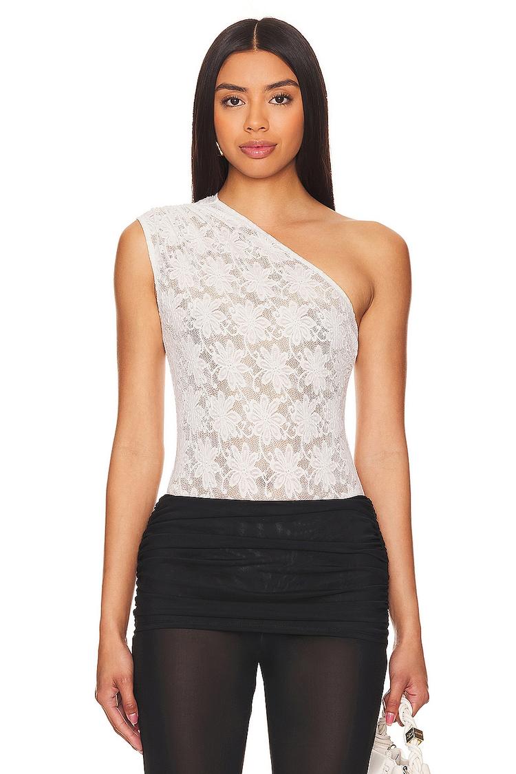 Delicate white lace and an asymmetric neckline create a striking silhouette in this slim-fit bodysuit. Designed with a sleeveless, strapless style and thong back closure, it offers a sleek, cropped length perfect for layering or statement looks. Crafted from stretchy nylon and spandex blend, this modern bodysuit brings both comfort and allure, making it ideal for casual outings, night outs, or romantic date nights. The all-over lace trim adds a touch of femininity and elegance, elevating your wardrobe with a sexy, chic vibe.