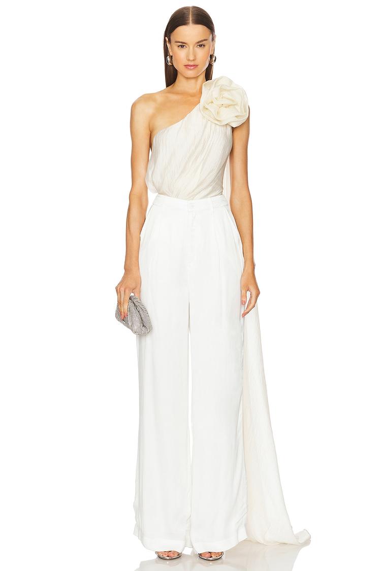 Ruched satin fabric in a matte white hue defines this fitted bodysuit with a dramatic one-shoulder strap and delicate rosette ruffle detail at the shoulder. The sleeveless, waist-length silhouette offers a sleek, elegant profile perfect for cocktail events, formal nights out, or upscale parties. A gusset snap button closure and thong back ensure a seamless fit, combining sophistication with comfort. This refined piece elevates any evening look with its clean lines and subtle texture, making it a standout choice for special occasions and glamorous outings.