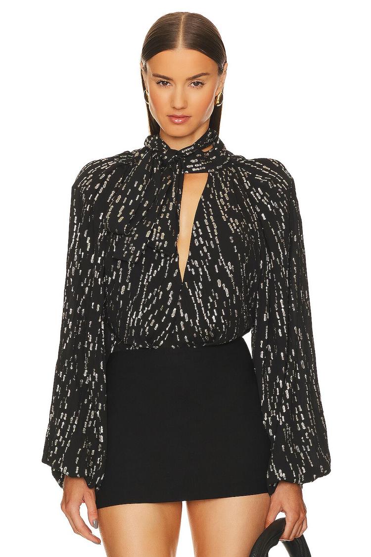 Metallic threading lends a shimmering abstract pattern to this fitted bodysuit crafted from lightweight georgette fabric. Featuring a draped halter neck tie and padded shoulders, its long puffed sleeves end in elastic cuffs for an elegant silhouette. The snap-button thong back ensures a smooth finish under skirts or pants. Ideal for night outs, cocktail events, and date nights, this chic bodysuit brings modern sophistication to your evening wardrobe.