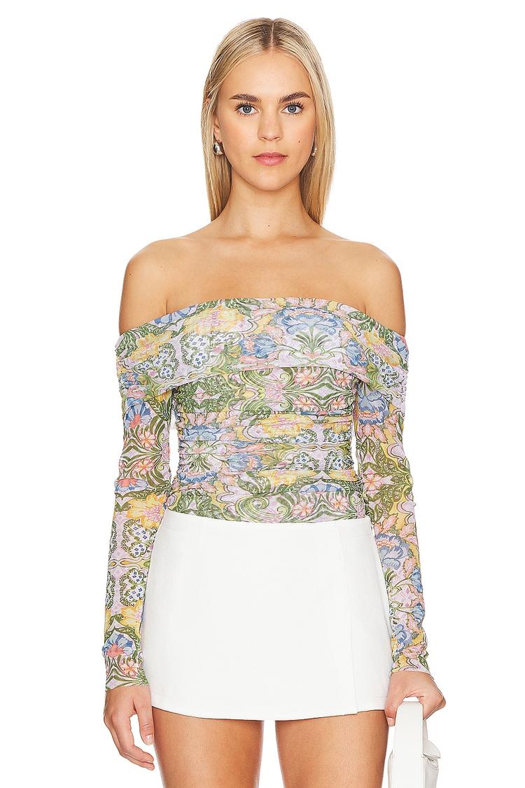 Lightweight mesh fabric meets a romantic off-shoulder neckline in this fitted bodysuit designed for spring and summer days. The waist-length silhouette features long regular sleeves and an all-over floral pattern in muted green, dusty blue, and dusty pink hues on a matte white base. Snap button closure at the gusset adds convenience while the sheer mesh lends an airy, chic feel. Perfect for casual outings, brunches, or date nights, this bodysuit blends bohemian charm with sophisticated style.