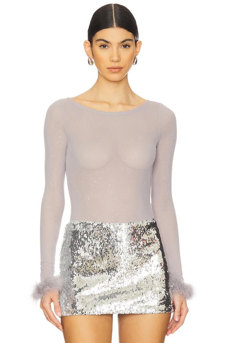 Delicately crafted with lightweight mesh fabric, this tight-fitting bodysuit features a classic round neck and long sleeves with feather trims at the cuffs, adding a sophisticated yet playful touch. The matte light beige hue offers a subtle elegance, perfect for autumn and winter evenings. Designed for effortless pull-on wear with a snap gusset closure, it combines comfort with style. Ideal for night outs, cocktail parties, and festive gatherings, this modern and trendy bodysuit elevates your evening wardrobe with its sheer panels and unique feather accents.