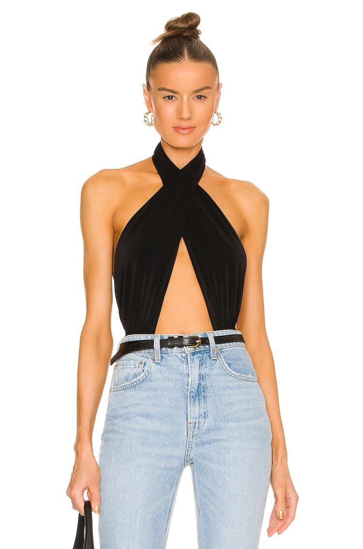 Bold and sleek, this black polyester-elastane bodysuit features a crisscross halter neck and a daring front cut-out that elevates its sexy and modern appeal. Designed for a tight fit, it effortlessly sculpts the silhouette while the strapless sleeve styling adds to its chic look. Ideal for spring and summer evenings, this pullover bodysuit is perfect for casual outings, date nights, and nights out, blending comfort with confident style.