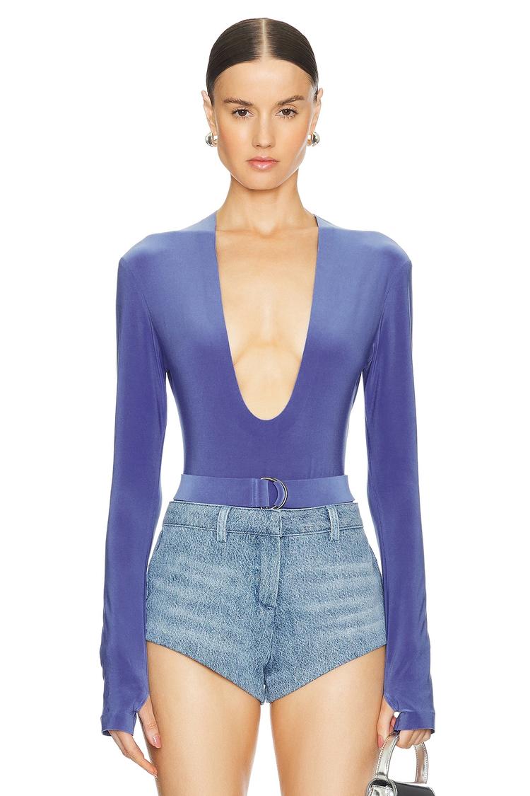 A sleek matte blue bodysuit with a deep U-neckline and long sleeves exudes modern sophistication. The close fit contours the body gracefully, enhanced by a detachable belt with a buckle detail at the front for added style. Crafted from stretchy polyester and elastane, this cropped-length piece offers comfort and versatility. Ideal for casual outings, date nights, or a chic night out, it pairs effortlessly with high-waisted bottoms to elevate your look with a sexy, contemporary edge.