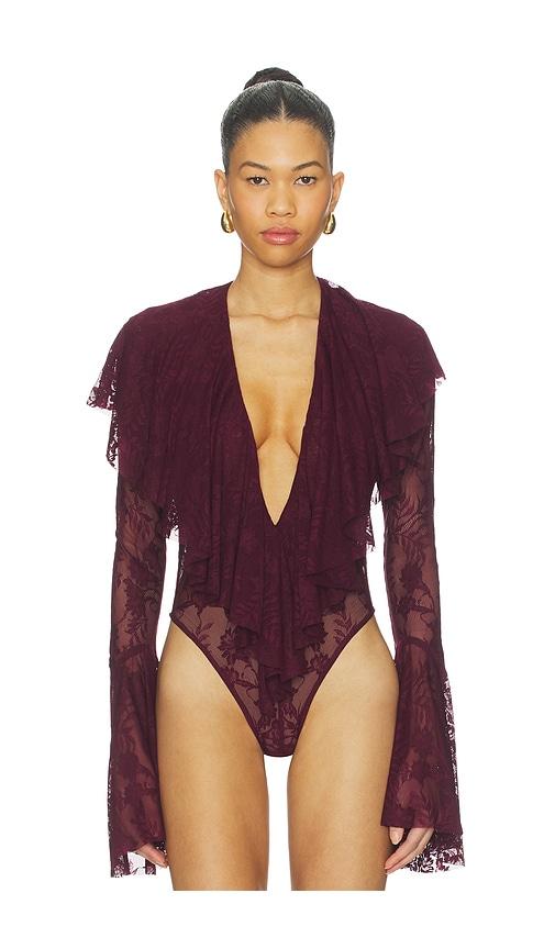 NORMA KAMALI LONG SLEEVE DEEP V RUFFLE BODYSUIT IN BURGUNDY.