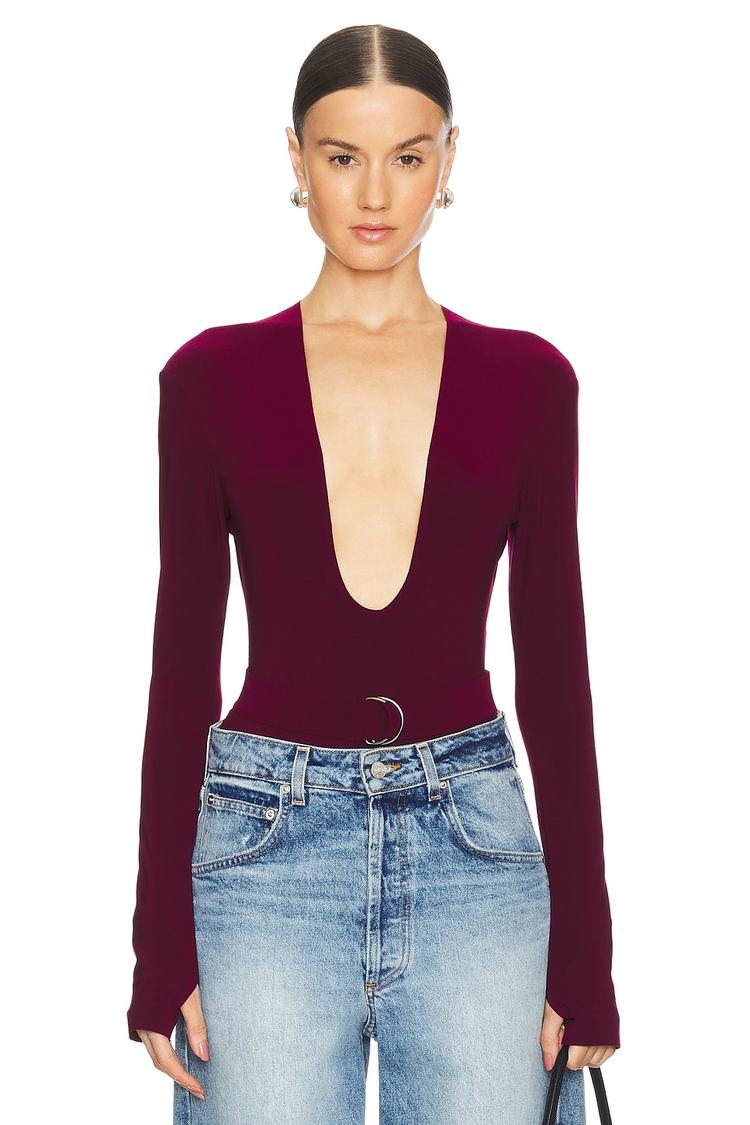 This slim-fitting bodysuit in matte burgundy features a daring deep U-neckline and long regular sleeves, crafted from a comfortable polyester-spandex blend. A detachable belt at the front adds a chic accent, enhancing its modern and sexy appeal. Ideal for casual outings, date nights, or a stylish night out, this piece offers versatile all-weather wearability. The snap button gusset closure ensures practicality without compromising style, making it a confident choice for those seeking a sleek, contemporary look.