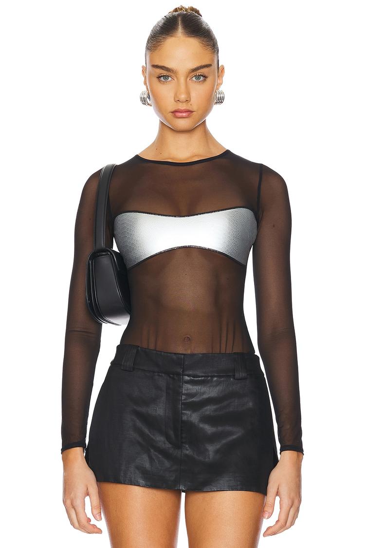 Sleek and daring, this tight-fitting bodysuit features a sheer black mesh fabric with long regular sleeves and a classic round neckline. The cropped length and attached metallic silver bandeau add a striking contrast, enhancing its edgy and modern vibe. Perfect for night outs, cocktail parties, or girls night, this bodysuit blends sexy appeal with chic sophistication. Crafted from stretchy nylon and spandex, it promises comfort and a second-skin fit, while the hook and eye gusset closure ensures secure wear.