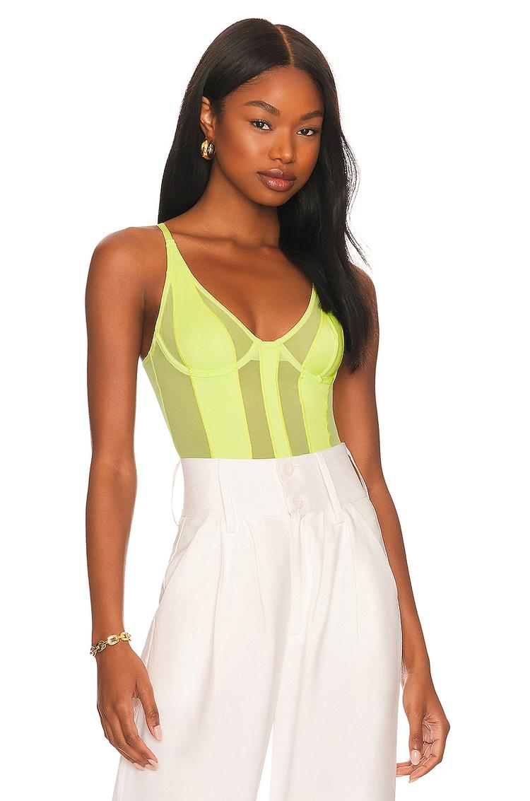 Light yellow mesh panels and a fitted silhouette define this swirl bodysuit, crafted from a comfortable polyester-spandex blend. Featuring unpadded wired cups and adjustable shoulder straps, it offers both support and style. The V-neckline and sleeveless design create a sleek, modern look perfect for summer nights, casual outings, or date nights. The gusset hook and eye closure with a thong back completes this sexy, contemporary essential.