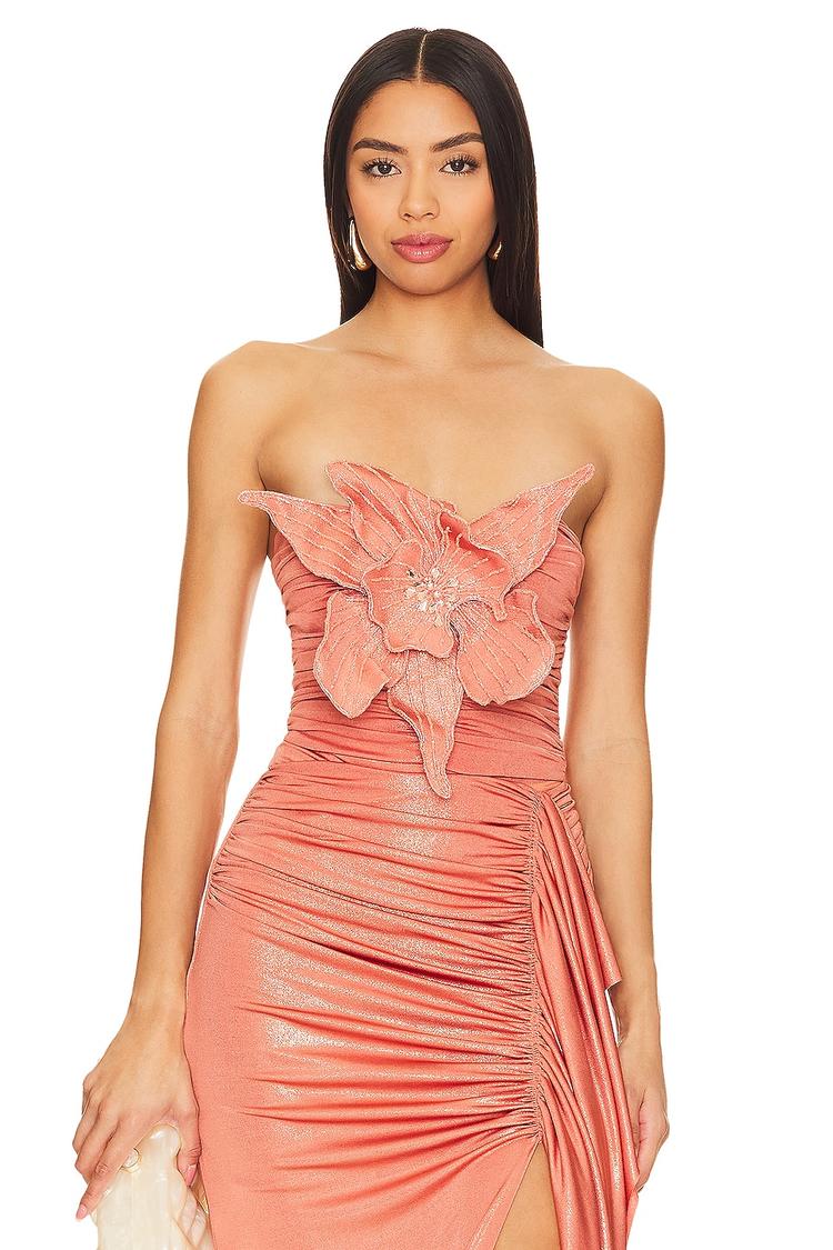 Sleek and seductive, this fitted bodysuit features a straight, strapless neckline and a cropped length that perfectly contours the silhouette. Crafted from a slinky jersey fabric with subtle metallic threading, it offers a sophisticated shimmer in dusty rose. The standout large orchid applique at the front adds a bold, elegant focal point. Designed with a boned bodice and hidden back zipper closure, this piece blends modern glamour with effortless wearability. Ideal for cocktail parties, night outs, and romantic date nights, this bodysuit delivers a confident, sexy look for warm spring and summer evenings.