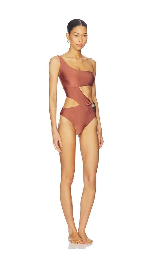 PATBO X CAMILA COELHO GOLDEN LUNE BODYSUIT IN METALLIC COPPER.