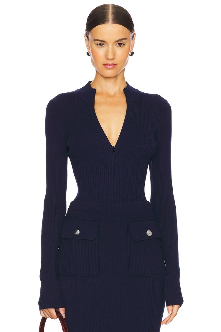 A sleek ribbed knit bodysuit in a deep matte navy blue, featuring a plunging V-neckline and long regular sleeves for a streamlined silhouette. The fitted design contours the body, enhanced by the functional front zipper and gusset snap button closures for ease. Its thong back style adds a daring, sexy edge, perfect for layering or standalone wear. Crafted from a viscose and polyester blend, this modern bodysuit suits autumn, winter, and spring wardrobes. Ideal for casual outings, night events, and date nights, it offers both style and comfort in one versatile piece.