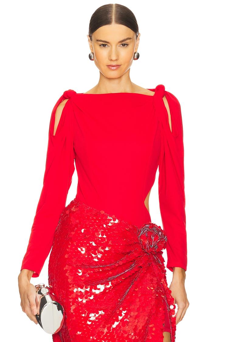 A striking red fitted bodysuit crafted from lightweight polyester jersey offers a sleek silhouette with long regular sleeves and a straight neckline. The standout shoulder cut-out details with knot accents add a sophisticated and elegant touch, perfect for cocktail parties, formal evenings, or a glamorous night out. Featuring a hidden back zipper and snap gusset closure, this chic piece combines style and functionality for confident, refined dressing.