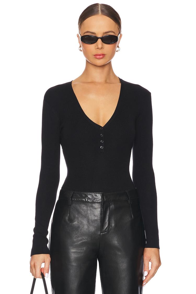 Crafted from a midweight ribbed jersey blend of bamboo and nylon, this fitted bodysuit features a sleek V-neck and long regular sleeves for a timeless silhouette. The partial front button closure adds subtle detail while the snap gusset ensures ease of wear. Its solid black hue and minimalist design make it versatile for casual days, workwear, and business casual settings. The covered back and comfortable stretch fabric promise all-day wearability, making it an essential layering piece or standalone style that exudes modern chic.