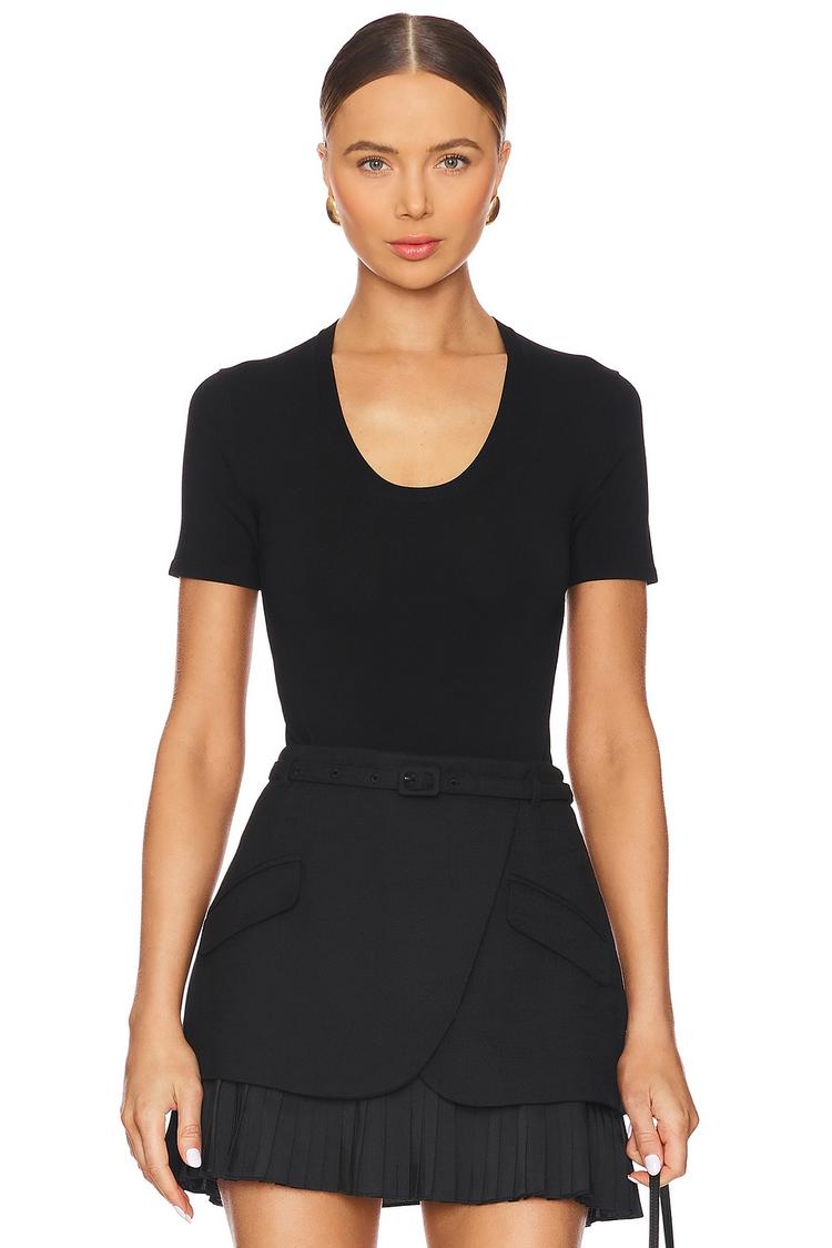 Sleek and timeless, this black bodysuit features a close fit and a classic round neck with ribbed trim for subtle texture. Crafted from a midweight, stretchy viscose-nylon jersey, it offers comfortable wear and a snap gusset closure for practicality. The half sleeves and covered back enhance its minimalist appeal, making it a versatile staple for casual days, workwear, or business casual settings. Pair effortlessly with skirts or trousers for a modern, polished look that transitions seamlessly from everyday wear to professional environments.