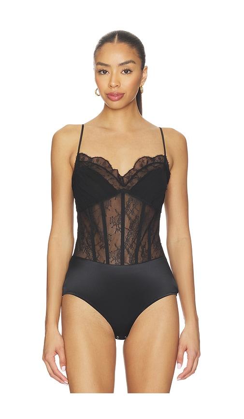 SIMKHAI ANGELINA LACE BUSTIER BODYSUIT IN BLACK.