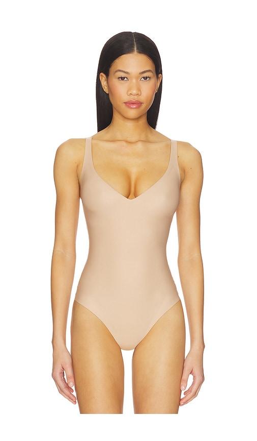 SKIMS BODY PLUNGE BODYSUIT IN TAN.