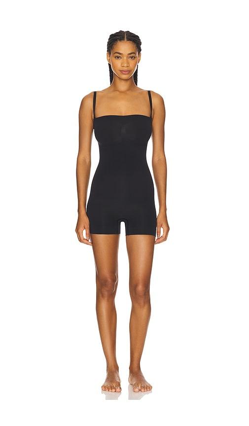 SKIMS SEAMLESS SCULPT STRAPLESS SHORTIE BODYSUIT IN BLACK.