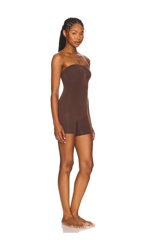 SKIMS SEAMLESS SCULPT STRAPLESS SHORTIE BODYSUIT IN CHOCOLATE.