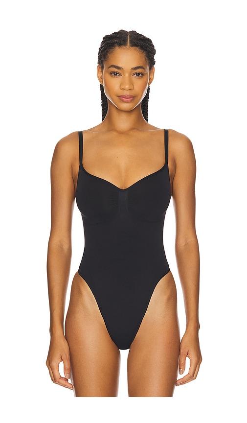 SKIMS SEAMLESS SCULPT THONG BODYSUIT IN BLACK.