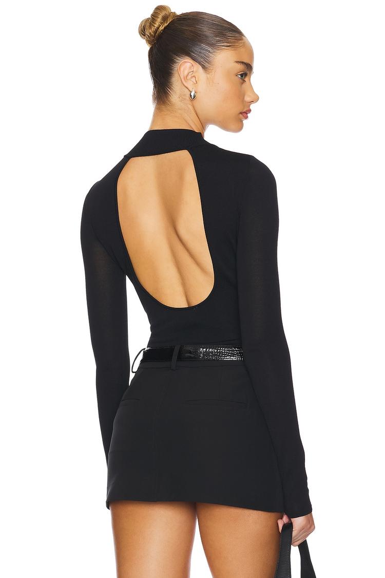 Sophisticated and sleek, this fitted bodysuit features a matte black semi-sheer fabric that subtly reveals what's beneath. The long sleeves and high neckline create a chic silhouette, while the daring open back adds a striking, sexy touch. Crafted from a comfortable viscose, nylon, and elastane blend, it offers stretch and ease of wear. Perfect for elevating your look whether you're heading to a night out, a stylish date night, or adding a modern edge to your workwear and business casual ensembles.
