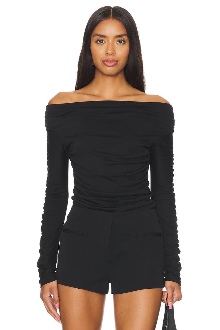 Ruched sides enhance the sleek silhouette of this black off-shoulder bodysuit, crafted from a soft rayon-polyester blend for a comfortable close fit. Featuring long sleeves and a pullover style with a snap gusset closure, it perfectly balances sexy and modern vibes. Its cropped length and elegant neckline make it ideal for casual outings, night outs, or date nights. This chic piece delivers effortless style with a flattering silhouette and versatile wearability across seasons.