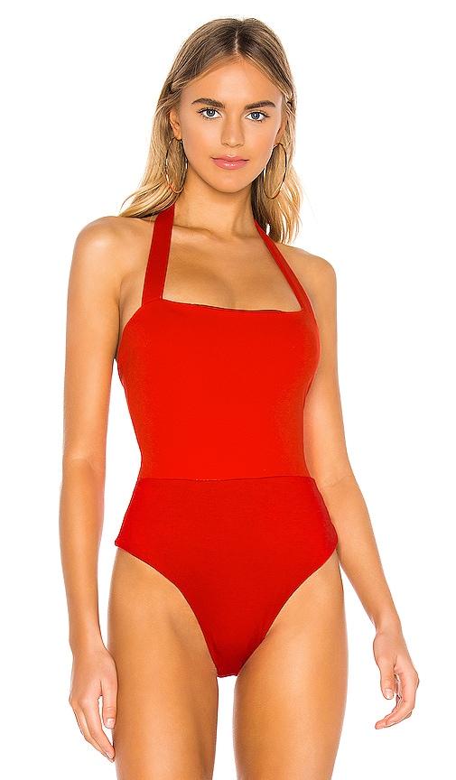 SUPERDOWN REECE HALTER BODYSUIT IN RED.