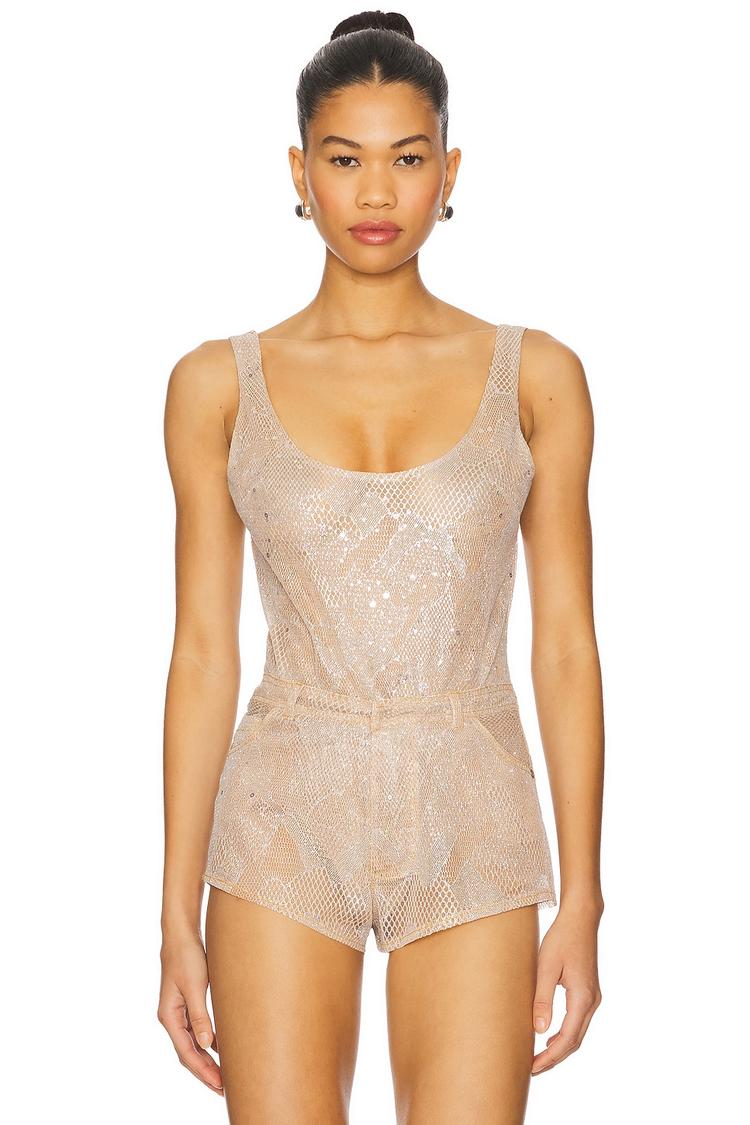 Shimmering light beige mesh defines this fitted bodysuit featuring all-over sequins for a standout look. The sleeveless design with wide straps and a flattering U-neckline offers a modern, sexy silhouette perfect for spring and summer nights. A concealed back zipper ensures a sleek finish, making it ideal for nights out, parties, and girls' night events. This cropped bodysuit brings a trendy edge to your evening wardrobe with its delicate fabric and sparkling details.