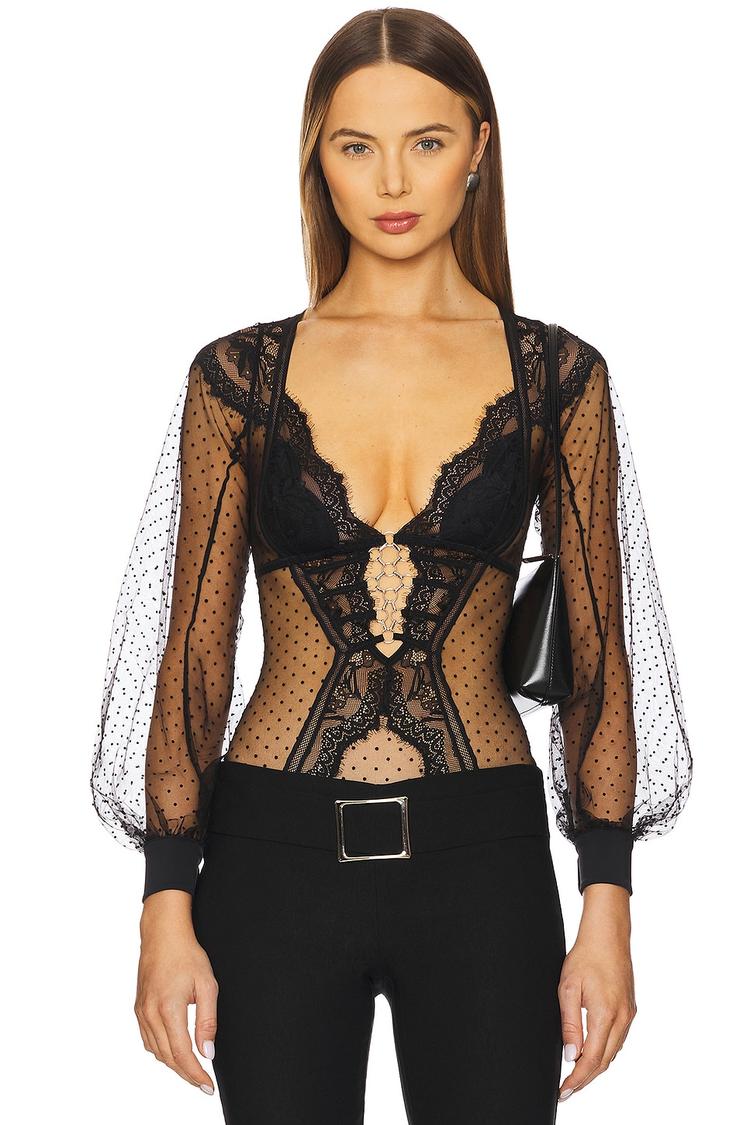 Sheer black polka dot mesh meets elegant balloon sleeves and a halterneck clasp closure in this fitted bodysuit. Featuring buttoned cuffs and a striking front cut-out detail accented with silver hardware, it delivers a sexy, chic silhouette ideal for night outs, date nights, and girls' night events. Crafted with a nylon-polyester blend and cotton lining, this alluring piece balances delicate texture with bold design, making it a captivating addition to your evening wardrobe.