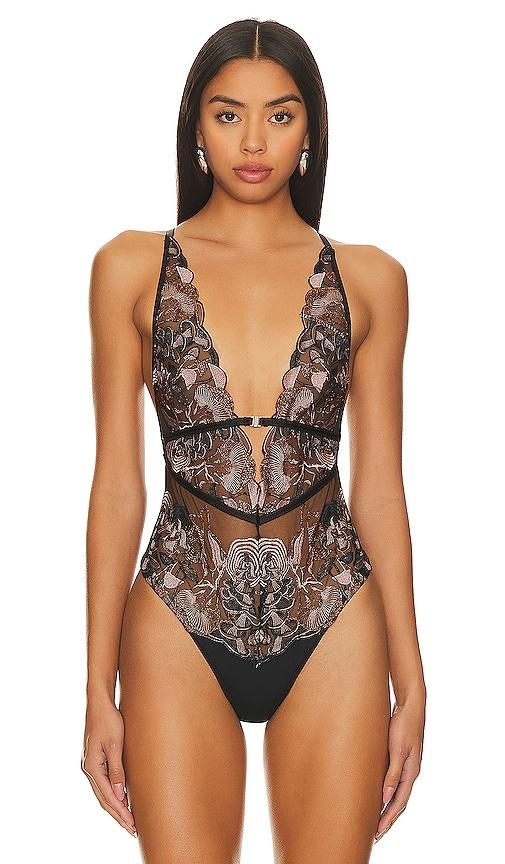 THISTLE AND SPIRE CHANTERELLE BODYSUIT IN BLACK.
