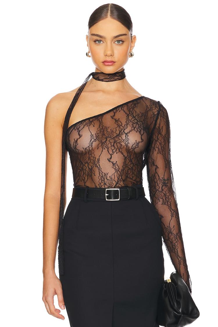Delicate floral lace and sheer polyamide blend combine in this close-fitting bodysuit, featuring an asymmetric neckline and a unique one-sleeve, one-strap design. The pull-on style with snap gusset offers ease and comfort, while the self-tie choker adds a chic detail. Perfect for date nights, girls’ nights, or night outs, this sexy and modern bodysuit elevates evening wear with its striking silhouette and breathable bamboo lining. Its sheer elegance and sleek black hue make it a bold statement piece for confident styling.
