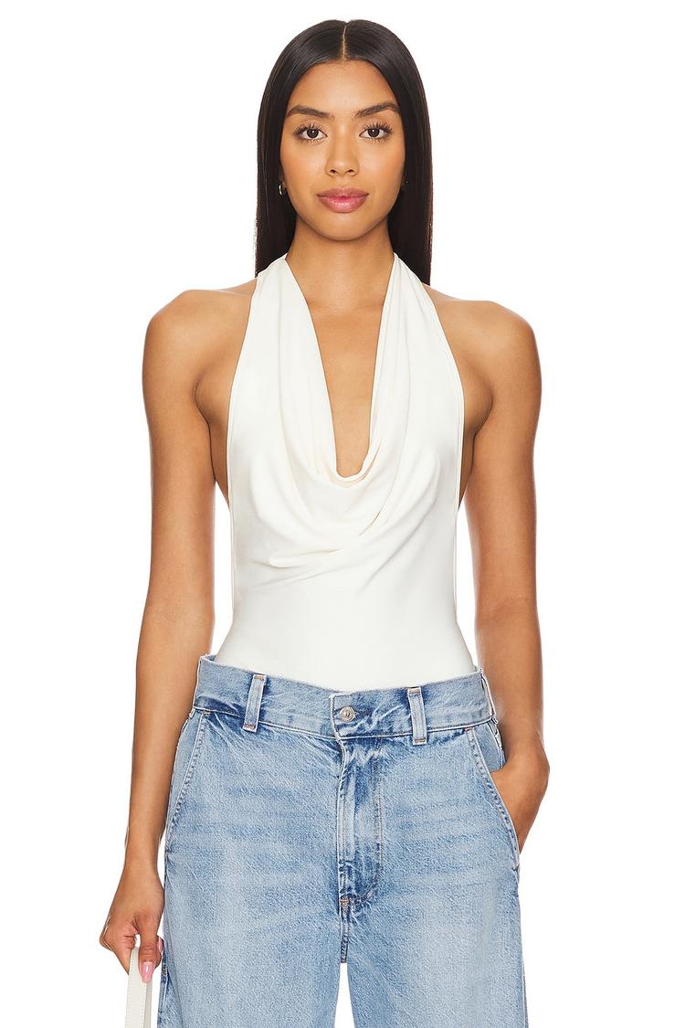 Soft draping and a plunging cowl neck define this fitted white bodysuit crafted from lightweight polyester-elastane jersey. The sleeveless halter neck silhouette offers a sleek, modern appeal, perfect for warm spring and summer days. Its snap button closure with thong back ensures a smooth fit, making it an ideal choice for casual outings, brunch dates, or stylish night outs. The minimalist design paired with subtle draping detail lends a chic, sexy edge to your wardrobe essentials.