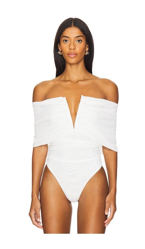 WEWOREWHAT RUCHED OFF SHOULDER BODYSUIT IN IVORY.