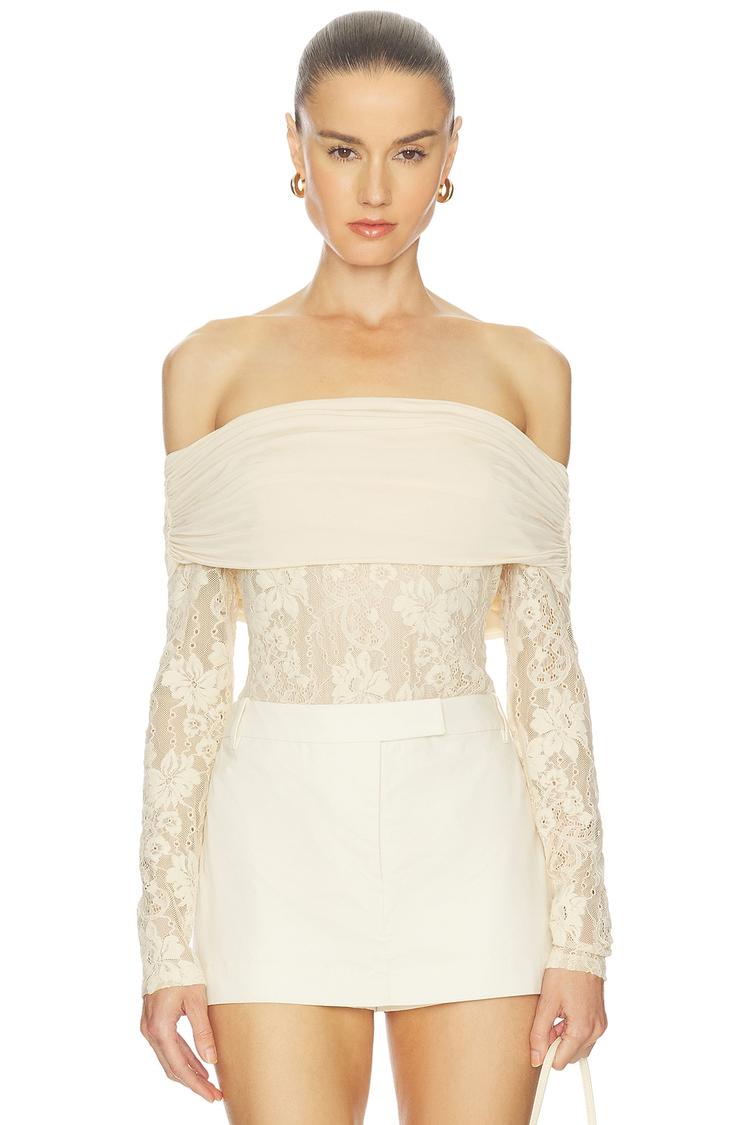 Delicate lace trim and an off-shoulder neckline define this close-fitting bodysuit, crafted from a lightweight blend of polyester, viscose, and nylon. The long sleeves and cropped length create an elegant silhouette with sheer panel details that add a sophisticated touch. Perfect for date nights, casual outings, or night events, this versatile piece pairs effortlessly with skirts or tailored pants for a polished look.