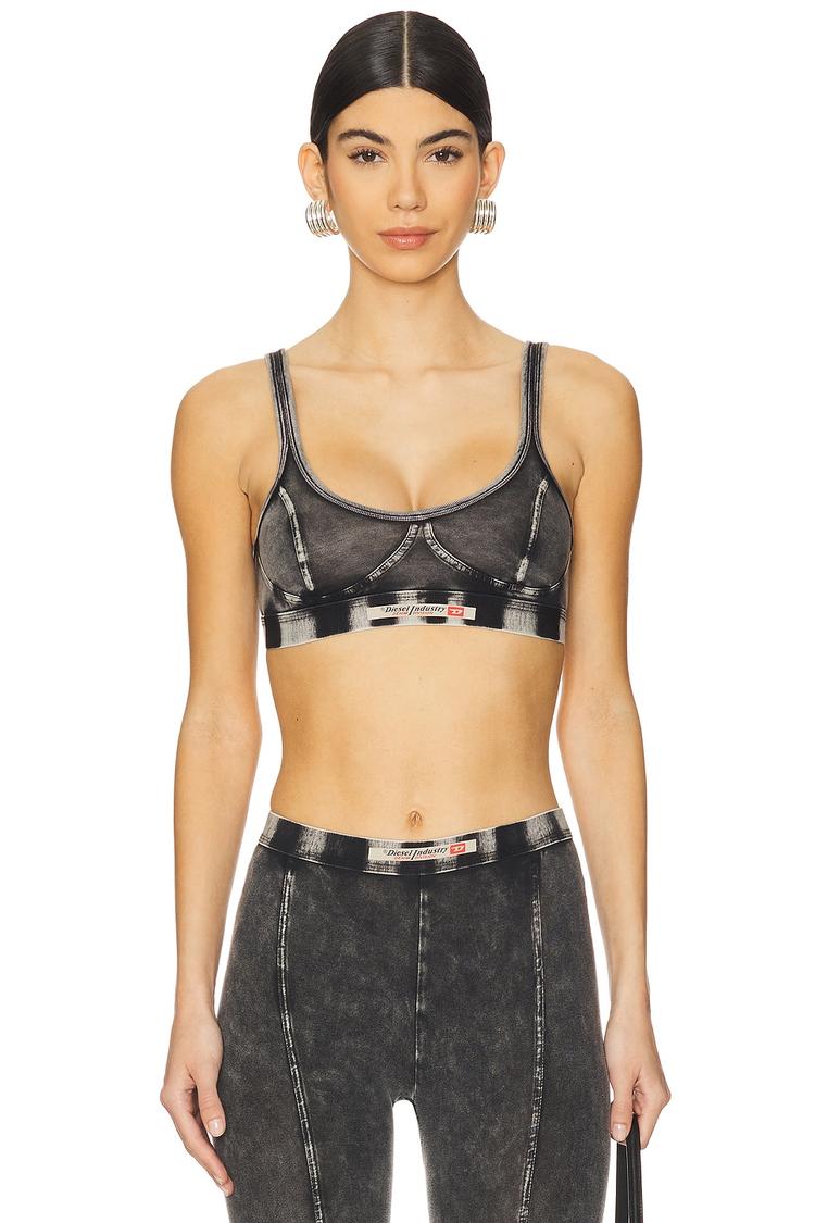 Lightweight cotton-elastane blend jersey fabric shapes this fitted bralette with a cropped length and classic U-neckline. Featuring thin straps and a covered back, the matte black piece is detailed with intentional fading for an edgy, street style vibe. Easy to pull on, it offers casual chic comfort perfect for spring and summer days. Versatile for casual outings, everyday wear, or streetwear looks, this Kassie Bra balances relaxed style with a sleek silhouette and subtle logo band detail for a contemporary edge.