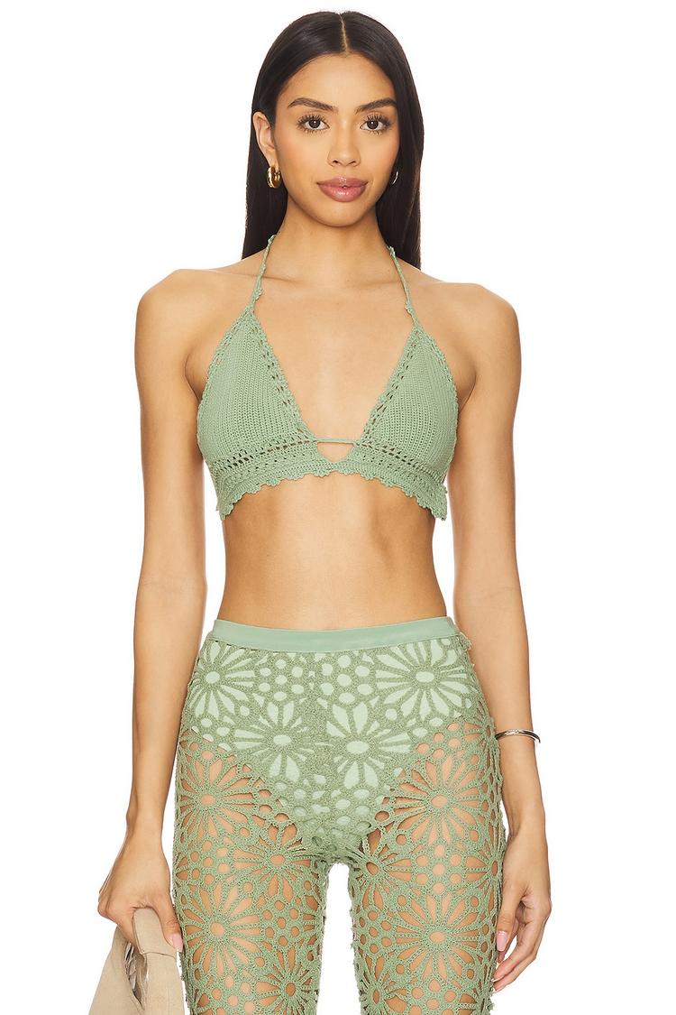 Soft cotton crochet and a close fit define this halterneck bralette in a serene light sage hue. Featuring tie-up closures at the back and neck, this cropped bralette offers a breezy, sleeveless silhouette perfect for warm weather. The intricate crochet design covers the entire piece, adding bohemian charm and casual chic appeal. Ideal for beach days, casual outings, and vacation wear, this bralette pairs effortlessly with layered looks or as a standout piece on its own.