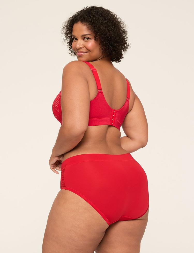 Available in Plus Size A hipster panty in extra-soft brushed fabric with 360 degrees of stretch (so it feels like bliss inside and out). Now with a pop of shimmery lace for holiday Bliss. Comfy flat waist and legs stay in place - no rolling, digging or binding. FIT: Hipster. A comfy-cute must-have with full booty coverage and a versatile, wear-with-anything rise. Sits below the belly button at the top of the hipHigher leg opening FEATURES: Comfy no-dig waist Shimmery Lurex lace trim FABRIC: Comfort Bliss. Soft, silky, sexy brushed fabric. 360 degrees of stretch. MACHINE WASH WARM WITH LIKE COLORS, ONLY NON-CHLORINE BLEACH WHEN NEEDED, TUMBLE DRY LOW, COOL IRON IF NEEDED BODY: 84% NYLON 16% SPANDEX LACE: 78% NYLON 18% SPANDEX 4% OTHER FIBER GUSSET: 100% COTTON WHY OUR PANTIES ARE THE BEST FOR CURVES: We design, test and refine on real bodies for the ultimate curve-perfect fit for every body Our feel-good elastics stay put-no slips or digs Our unique-for-curves construction keeps you wedgie-free We reinforce the softest threads for extra-secure seams that last wash after wash Shop the Comfort Bliss Collection to get the matching bra Item Number #413323 Imported Plus Size Panty Cacique Intimates ". Plus Size Comfort Bliss Lurex Lace Hipster Panty, in Venetian Red, 6/8, Women's, Cacique for Lane Bryant