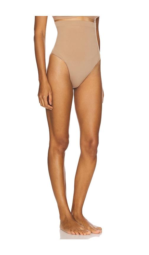 SKIMS SEAMLESS SCULPT HIGH WAIST THONG IN BEIGE.