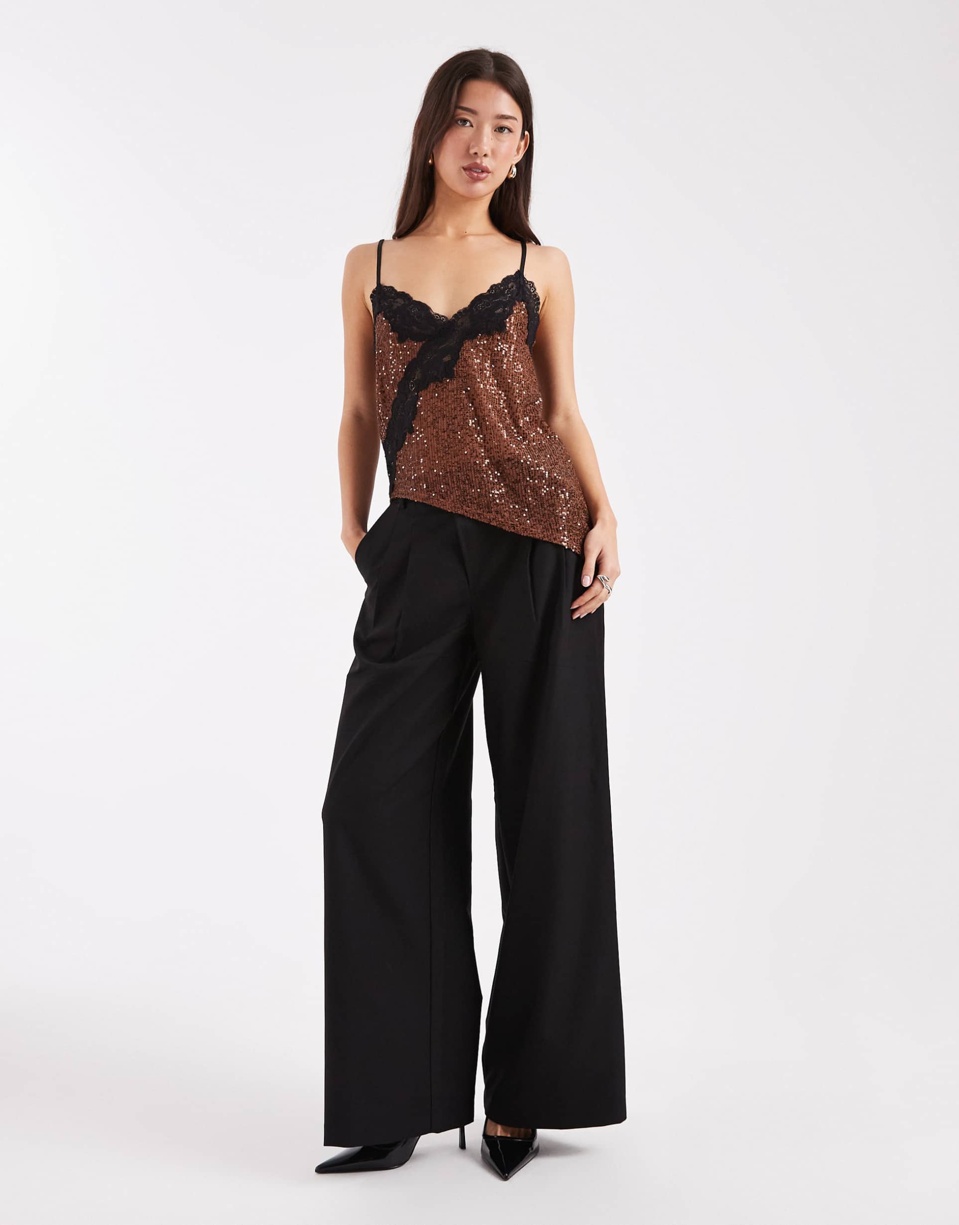 ASOS DESIGN ASYMMETRIC SEQUINED CAMI TOP WITH LACE TRIM IN BROWN