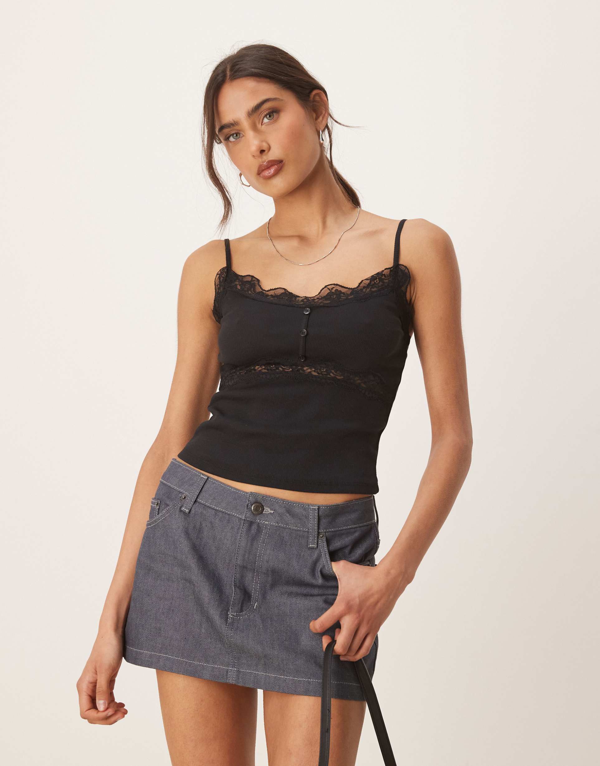 ASOS DESIGN RIBBED CAMI TOP WITH LACE AND BUTTON DETAILS IN BLACK