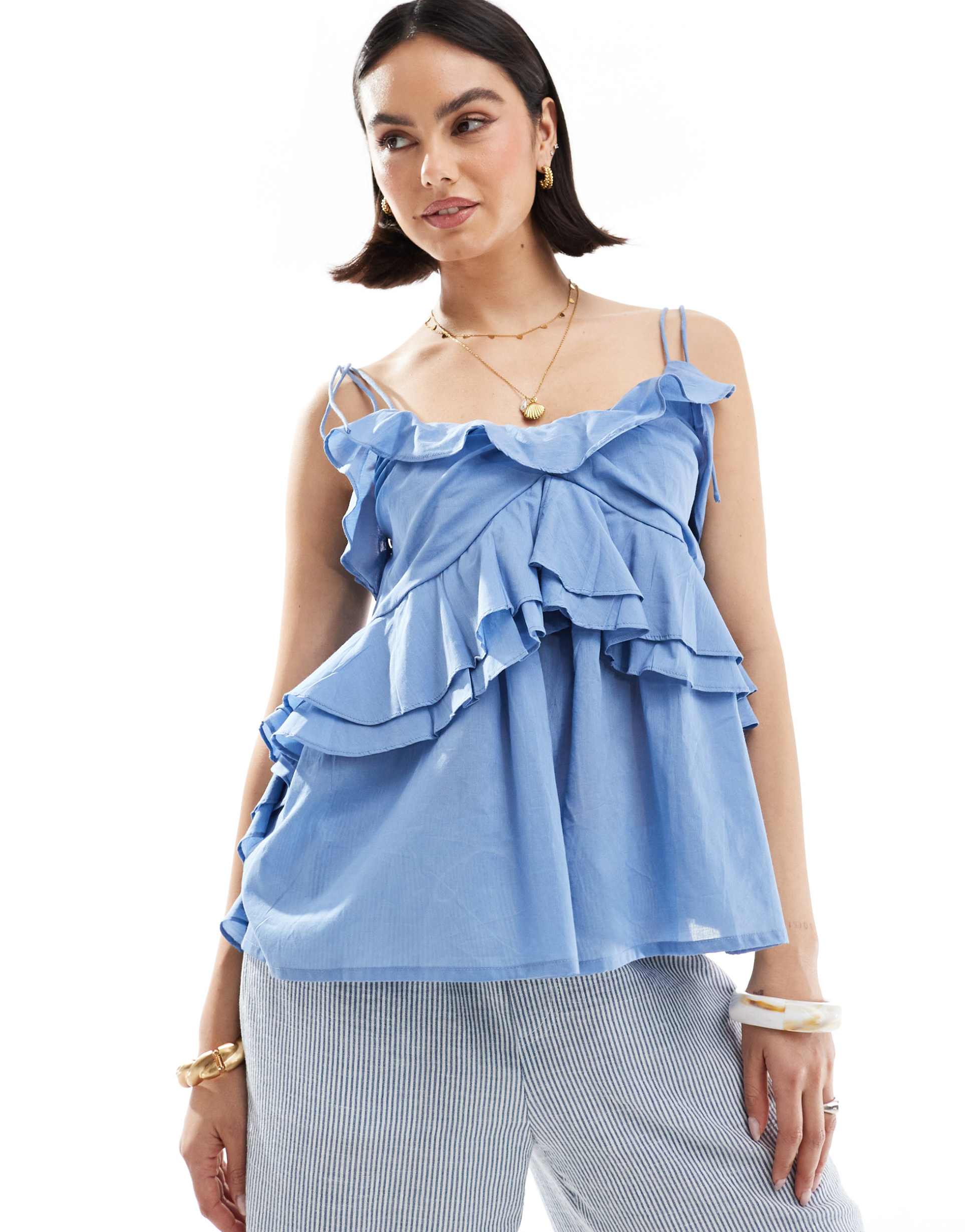 ASOS DESIGN RUFFLE CAMI TOP WITH TIE STRAPS IN BLUE
