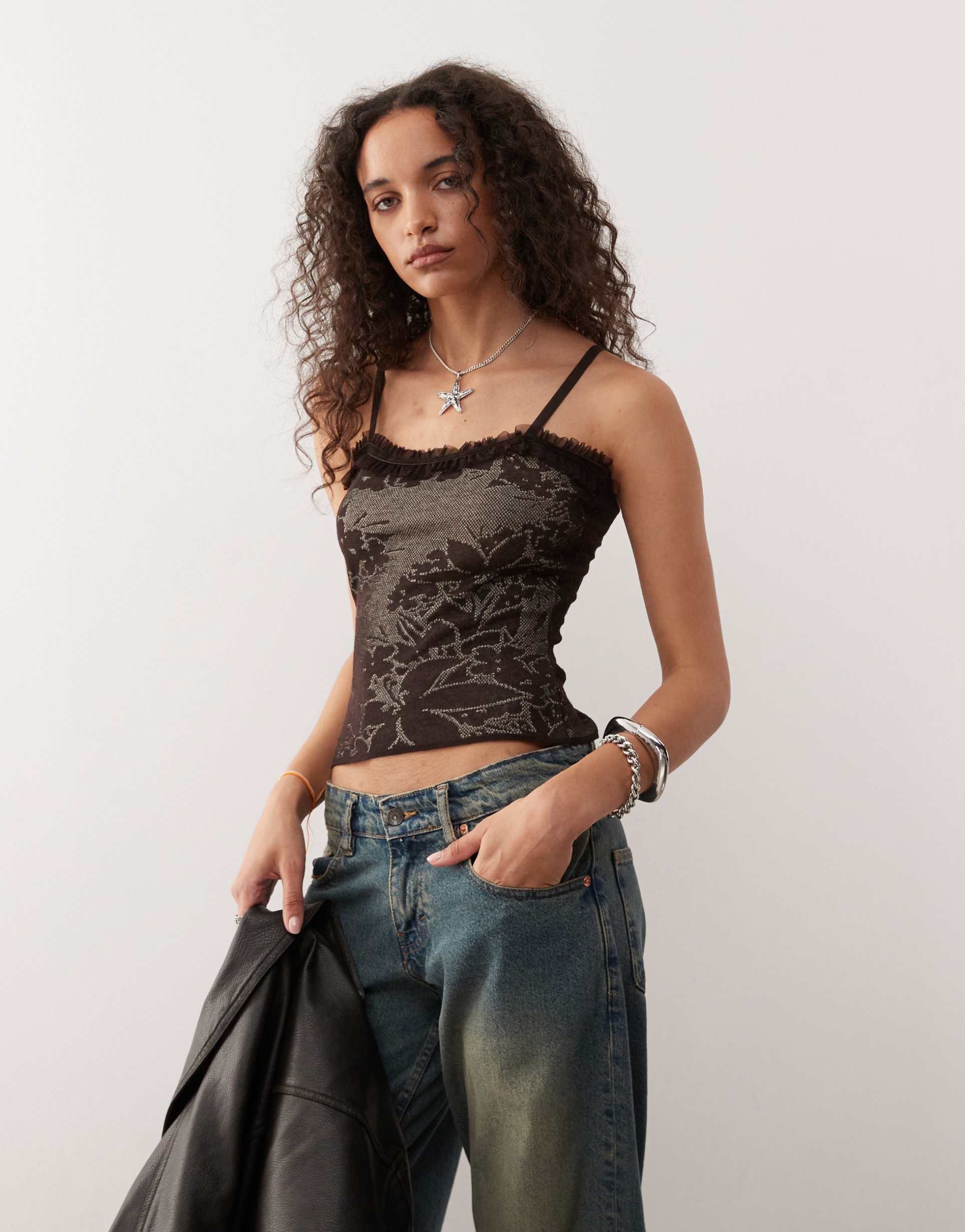 COLLUSION KNIT CAMI TOP WITH RUFFLE DETAIL IN BROWN