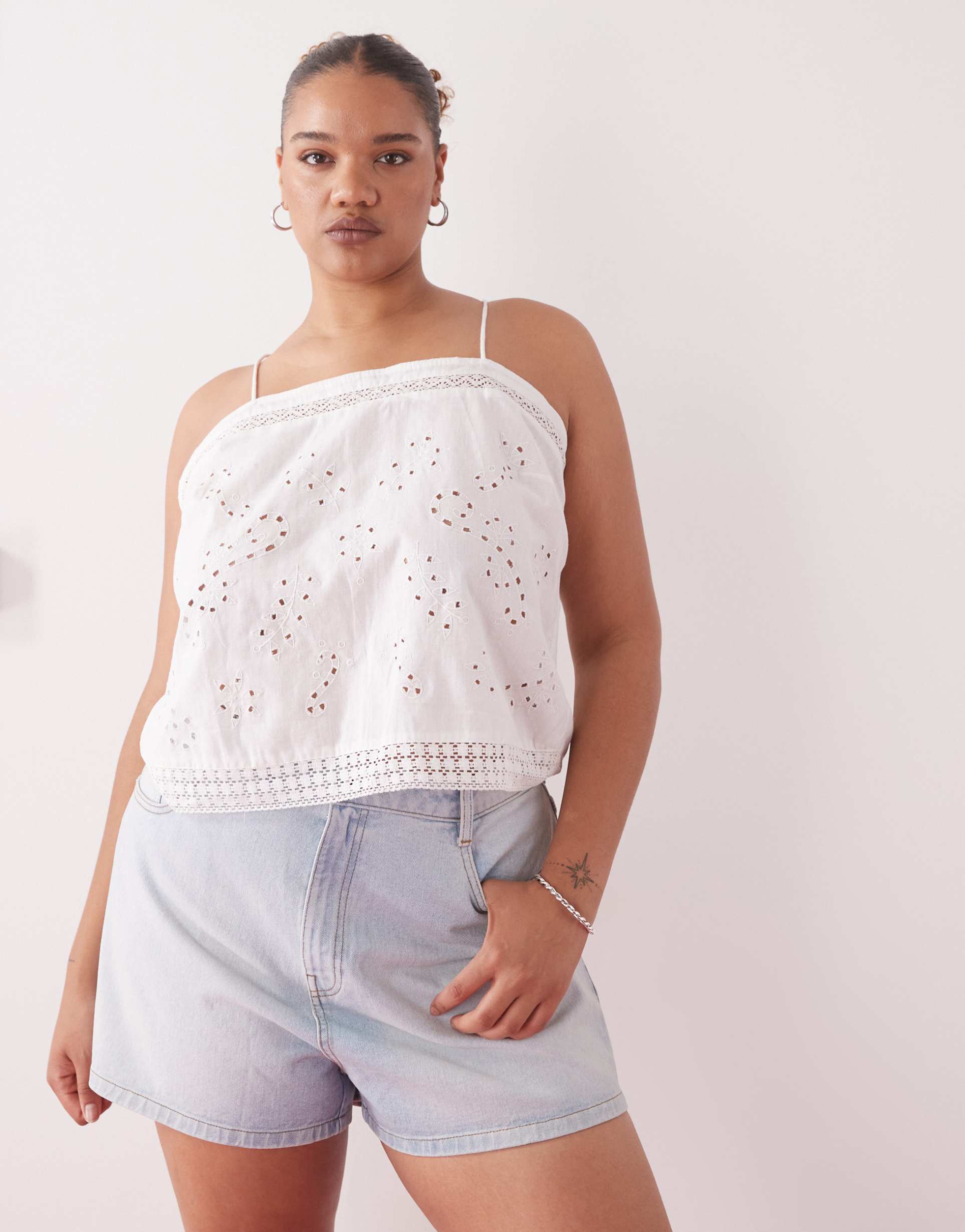 Delicate eyelet embroidery and a square neckline shape this plus size camisole top in crisp white cotton-linen blend. The regular fit and spaghetti straps create an easy, breezy silhouette perfect for warm spring and summer days. The open back features a stylish tie-up closure adding a bohemian touch to the lightweight fabric. Ideal for casual outings, beach days, or relaxed vacation looks, this waist-length cami combines breathable comfort with standout design details for versatile wear.
