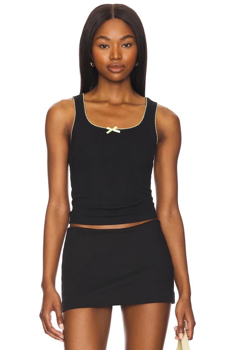 Lightweight pointelle fabric and a slim fit create a sleek silhouette in this black camisole. Featuring a classic scoop neck and delicate spaghetti straps, it ends at waist length for easy layering or standalone wear. Subtle yellow bow accents on the front and back add a charming touch to the minimalist design. Crafted from a breathable cotton-polyester blend, this versatile piece suits casual, everyday, and travel wardrobes, especially in spring and summer. Slip it on effortlessly for relaxed loungewear or casual chic styling.